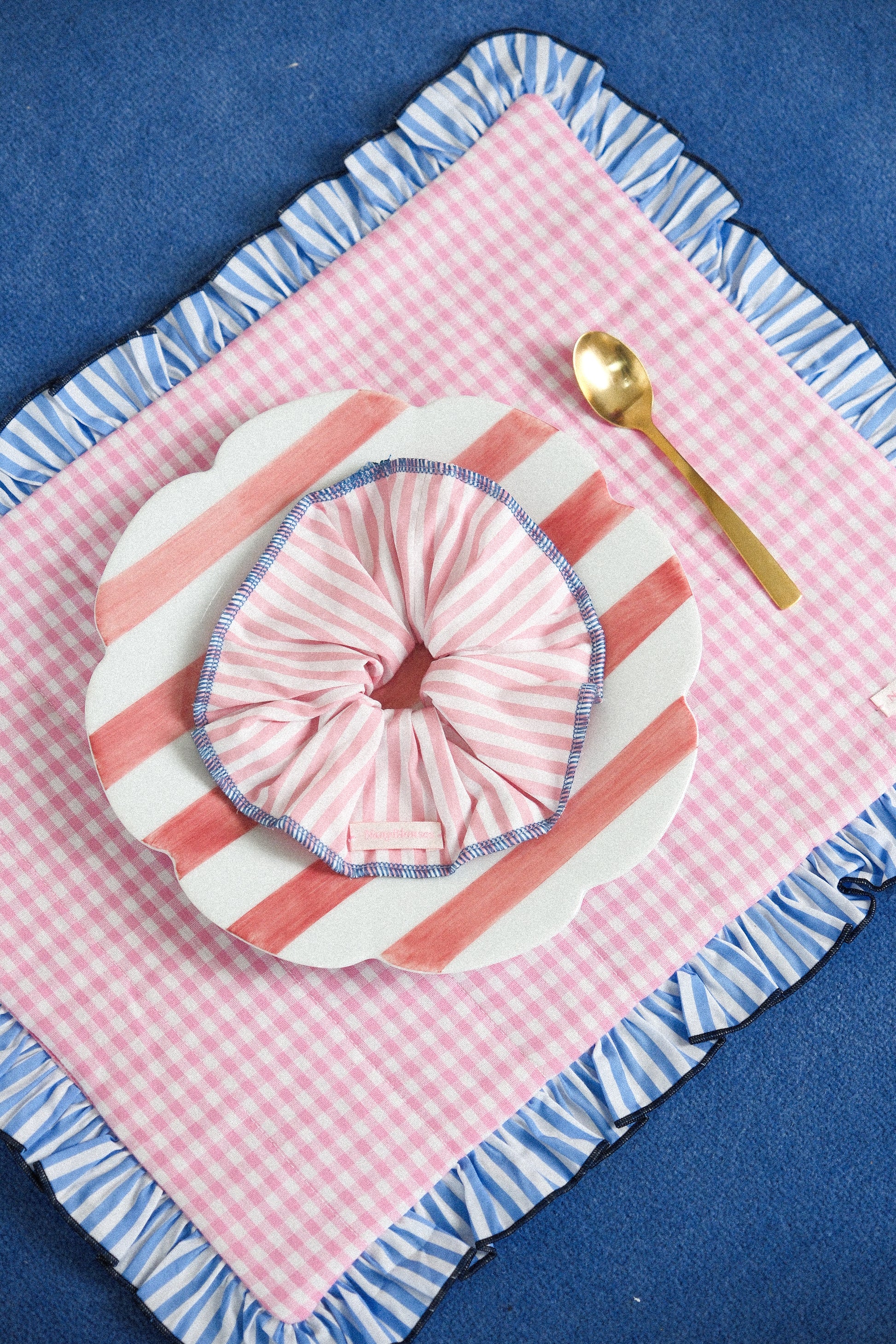 Rayures roses, finitions surjet bleu.