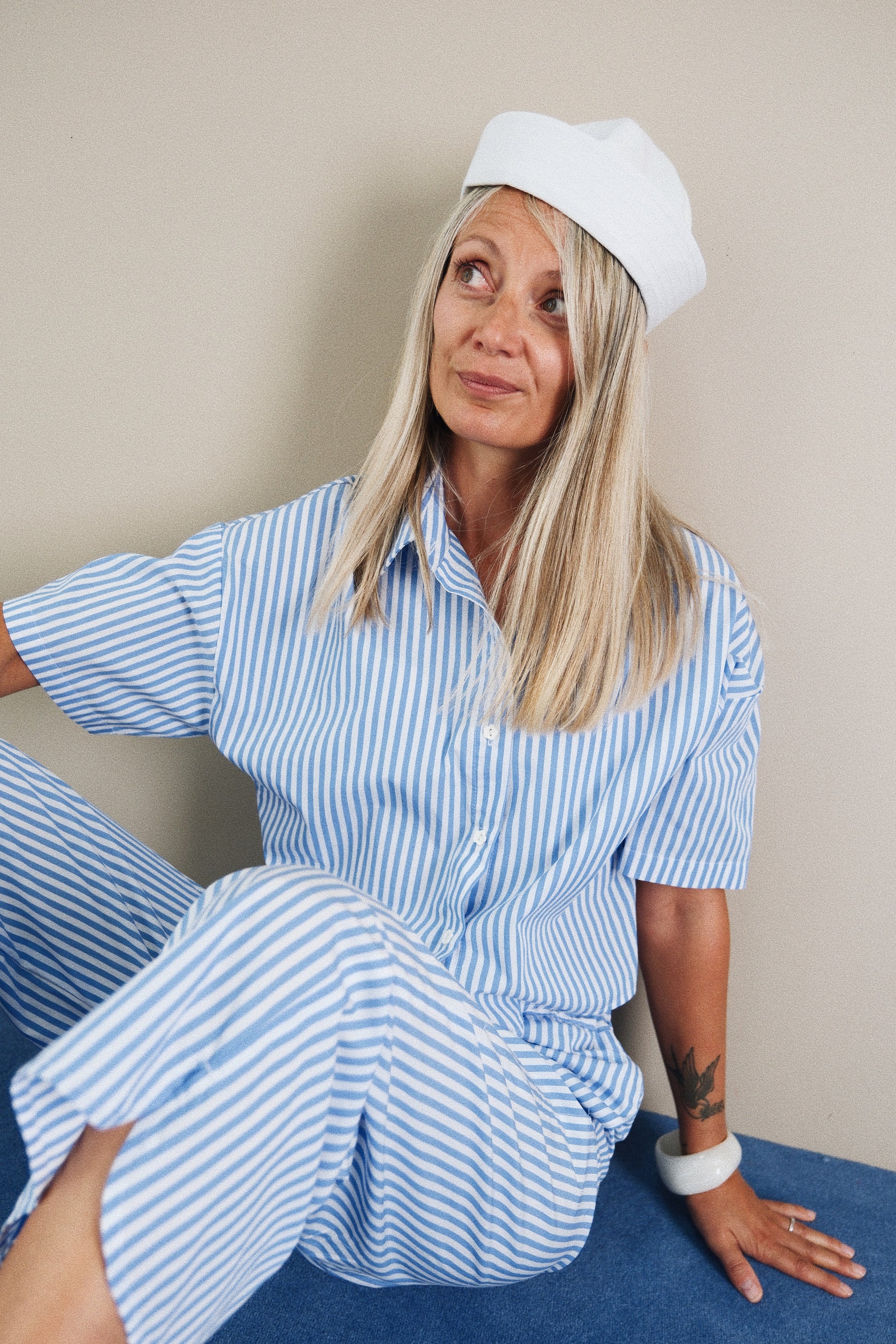 Notre pantalon Dolly en fines rayures bleu et blanc est de forme droite