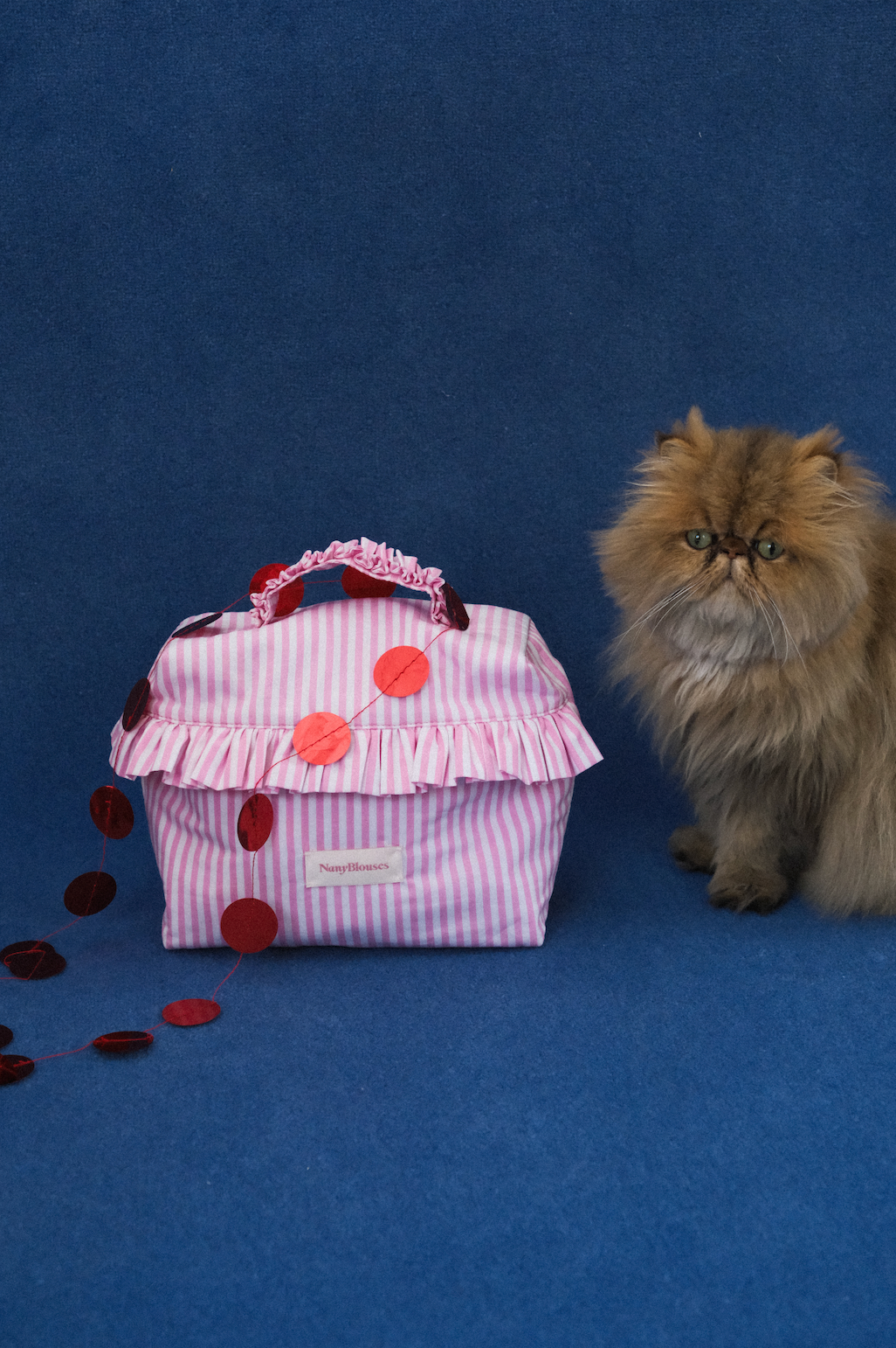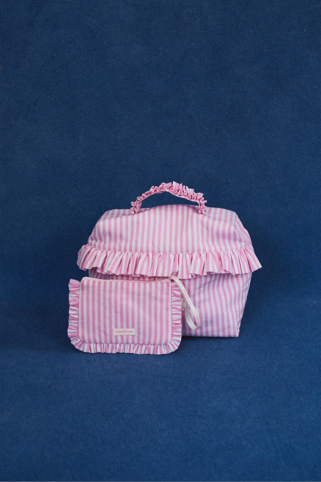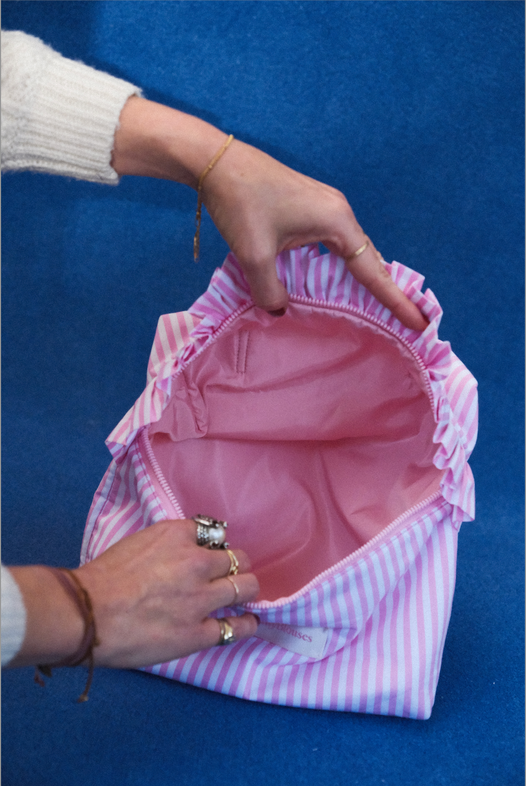Trousse de toilette avec détails de volants sur la anse et autour de la fermeture.